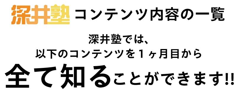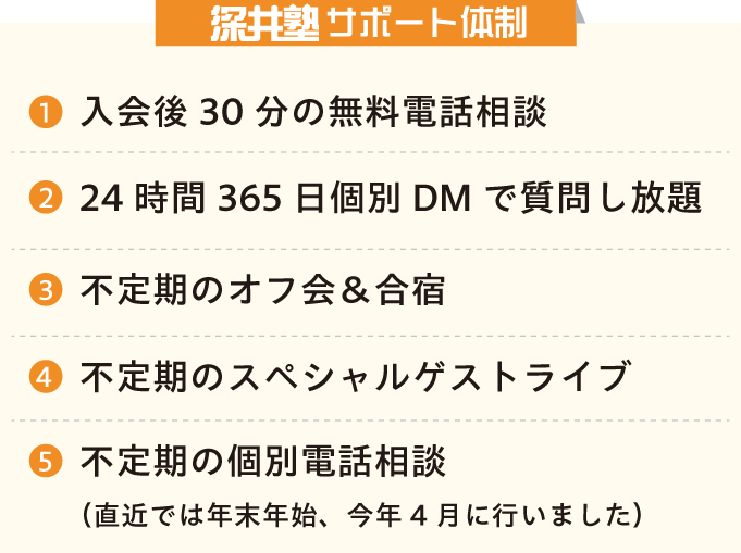 また深井塾へ参加してくれた方で、もっと成果を出すために、行動したい!という人へ向けて、「行動コミットコース」「個別コンサルティング」というコースもご提供しています。 行動コミットコースでは、まず最初に僕と個別ミーティングで方向性を決めてから、毎週グループZOOMをつなぎ、進捗報告、質問、相談ができる環境を提供しています。