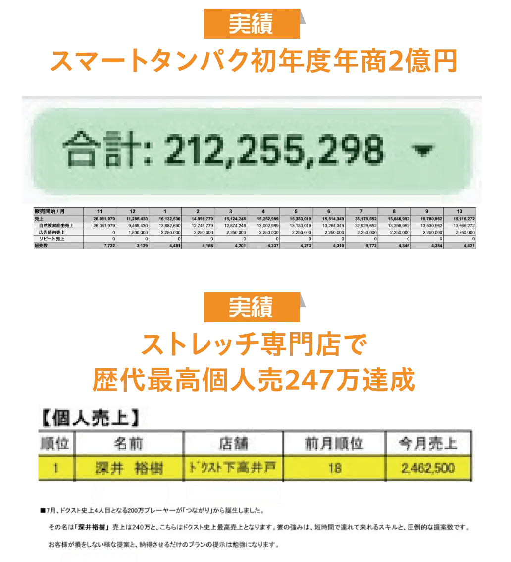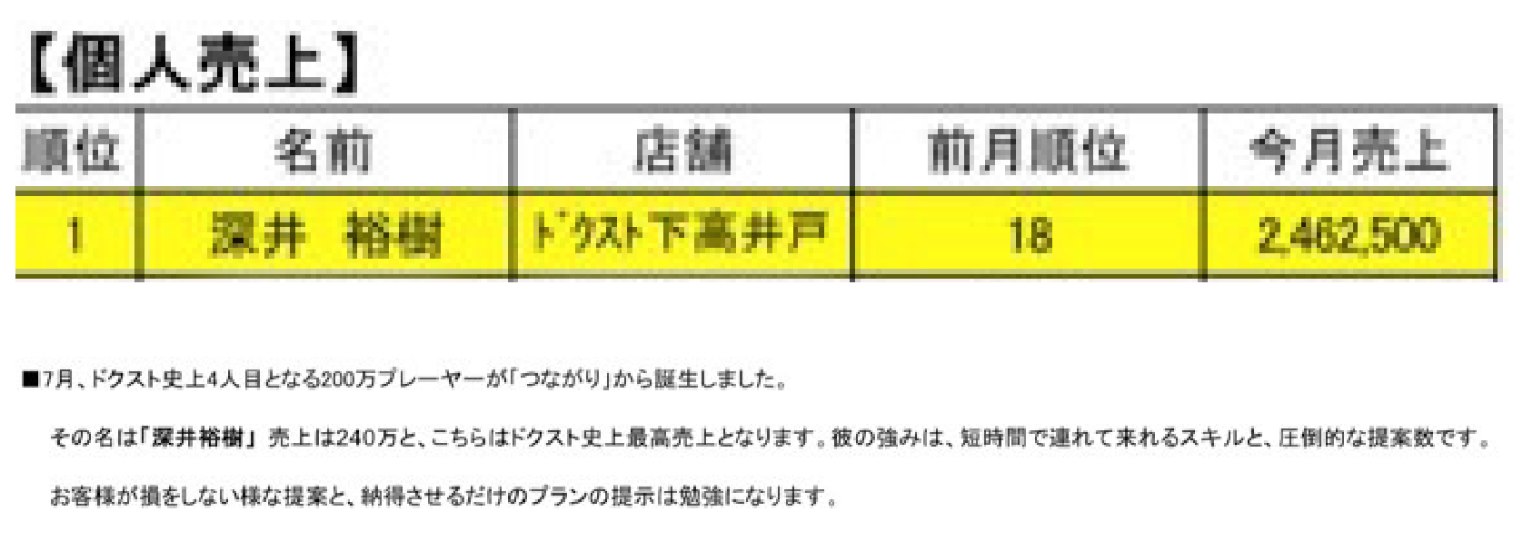 店長に「深井、もう良いんじゃないか?これだけ練習したら、もう大丈夫だ!」と言われ、自信がつき、歴代最高記録の月間個人売上246万円を達成しました。